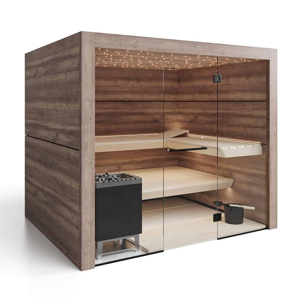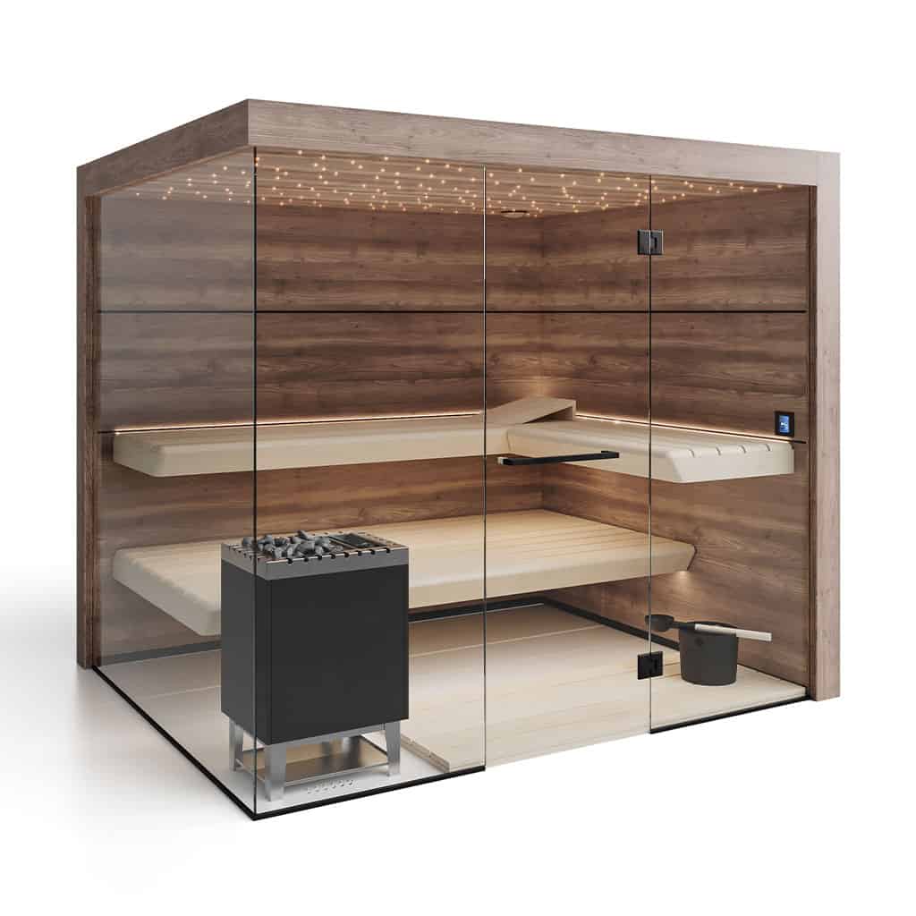 Soft ambient LED lighting beneath the benches and a starry canopy above create a stunning interplay of light and shadow, enhancing the spacious and tranquil atmosphere. The Ascent collection, available in Finnish, BIO, infrared, or hybrid options, invites you to indulge in unparalleled relaxation.